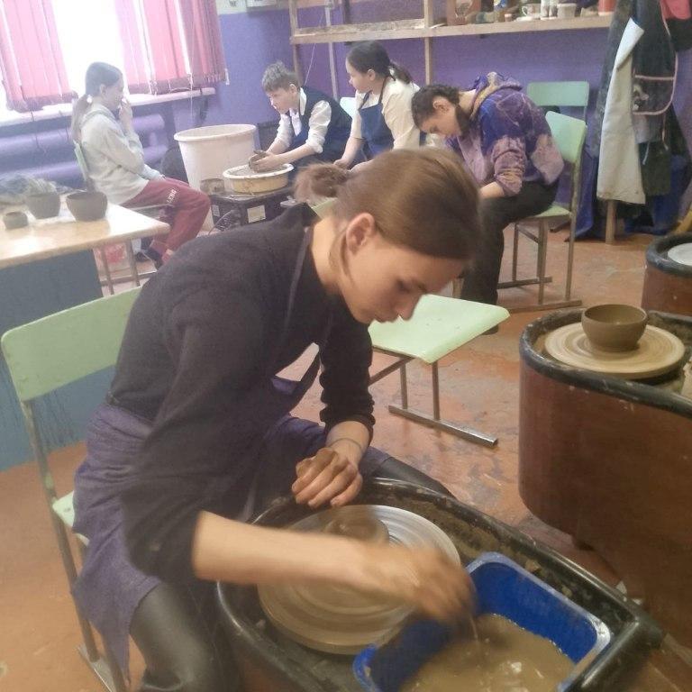 Так, в мастерской по гончарному делу тарские школьники под руководством Смолина Михаила продолжили осваивать тонкости работы на гончарном круге по созданию глиняных сосудов различной формы, а также пробовали свои силы в глазировании своих изделий.