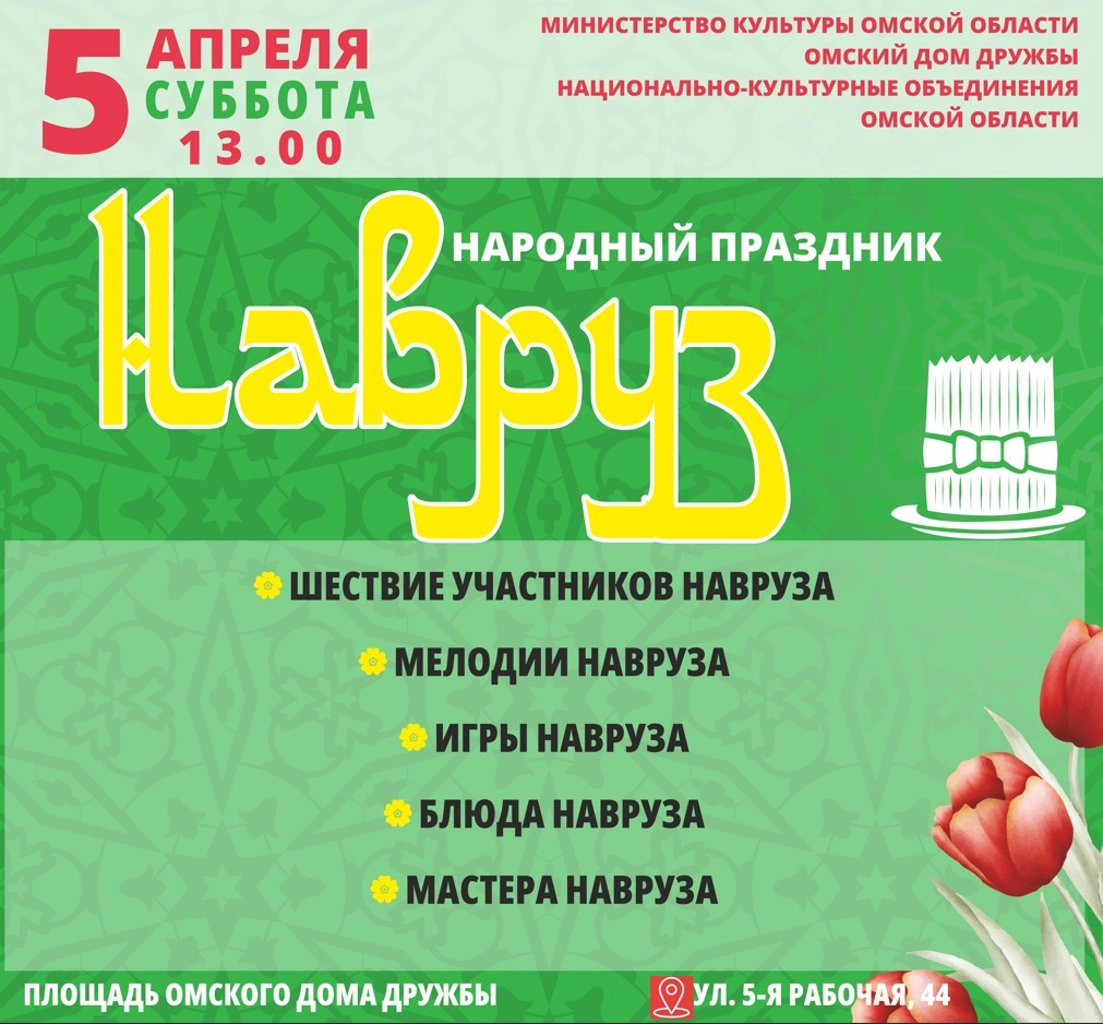 5 апреля 2025 года на площади Омского Дома Дружбы состоится народный праздник Навруз. Этот праздник исторически связан с традициями и обычаями тюркских народов (в Омской области это казахи, татары, киргизы, узбеки, таджики, азербайджанцы, курды). В то же время, программа праздника рассчитана на зрителей разных возрастов и национальностей.