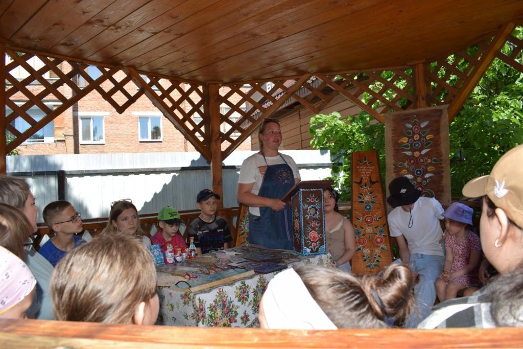 Программа мероприятия включала обзор выставки утилитарных изделий с урало-сибирской росписью двух тарских красильщиц Тарасевич Татьяны Николаевны, учителя изобразительного искусства Тарской гимназии № 1 им А. М. Луппова, и Паршуковой Натальи Рафаиловны, руководителя клубного формирования Самсоновского сельского Дома культуры. Они кратко рассказали историю этой традиционной для Урала и Сибири росписи, объяснили символику некоторых ее элементов, например, традиционный мотив росписи «Древо жизни» символизировал семью, где цветы — это родители, а ягоды и бутоны- дети, птицы и животные — хранители рода.